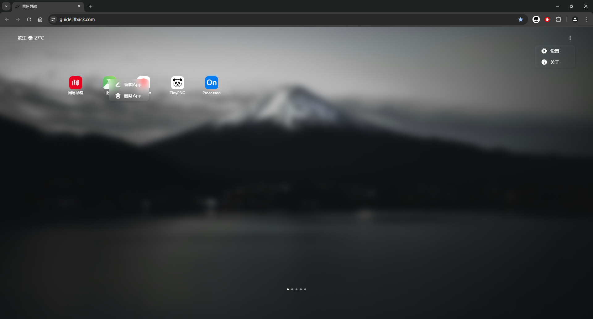 页面顶栏左侧为天气组件(天气数据来自和风天气),组件会显示指定地点今天、明天和后天三天的天气,默认地点为北京。