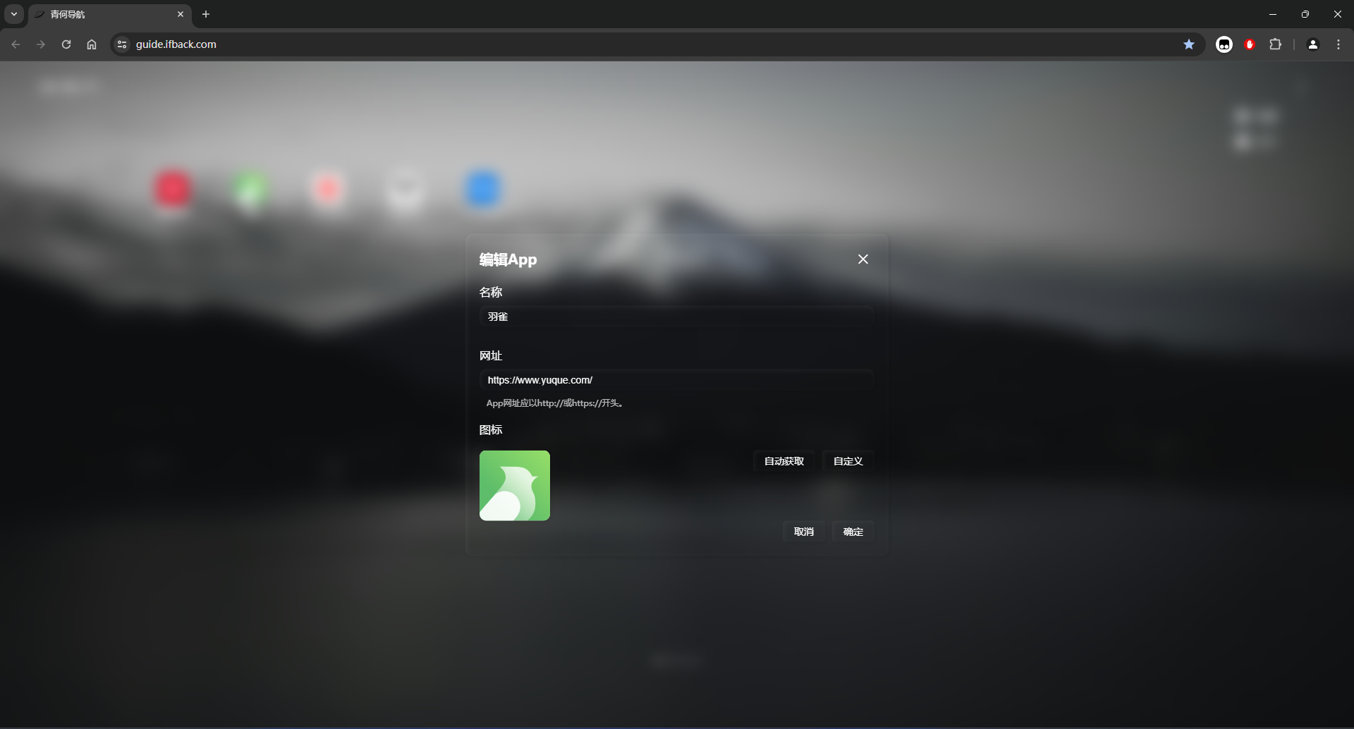选择编辑图标,打开图标编辑页面,可以编辑图标名称、网址。默认提供的网站,图标无需自行设置,如果自己添加图标,可以点击自动获取图标按钮,网站会自动尝试获取图标。如果获取失败或者对获取的图标不满意,可以自定义上传。